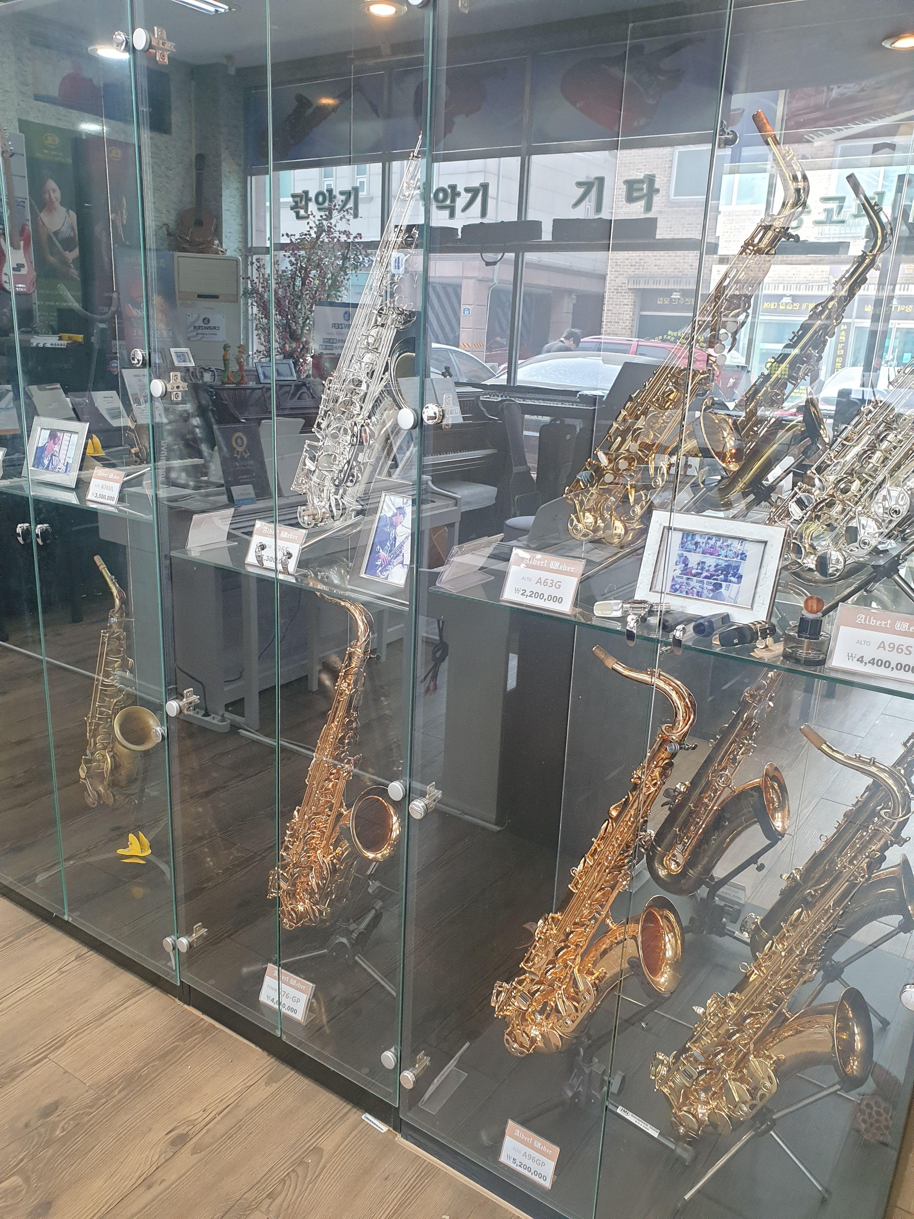 다양한 색소폰 용품들도 전시되어 있습니다.